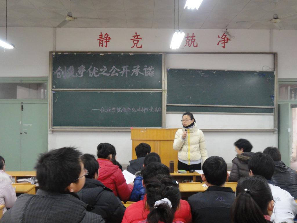 为积极响应党中央号召,加强学生党员的党性修养,切实开展党员创先争优活动, 3月6日上午,维多利亚3308老品牌低年级本科生党支部在生化楼2023教室召开支部大会,开展创先争优之公开承诺活动。会议由低年级党支部书记朱琳老师主持。