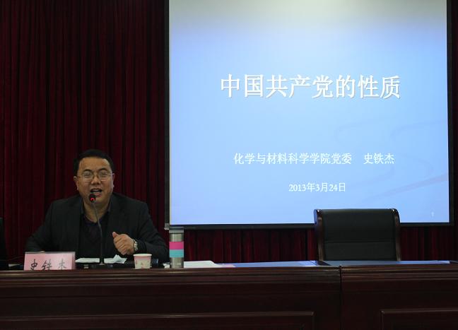 典礼结束后,史铁杰为学员开了党课的第一讲——《中国共产党的性质》。史铁杰从基本概念的解析引入、党的性质规定和具体涵义解析三方面为大家详细的讲解的中国共产党的性质。最后,史铁杰重点从五个方面解读了“大学生党员如何努力实践‘三个代表’重要思想和保持党的先进性”这一实际问题,并勉励大家坚定理想信念,努力学好化学专业知识,积极投身实践,为全面建成小康社会贡献力量。