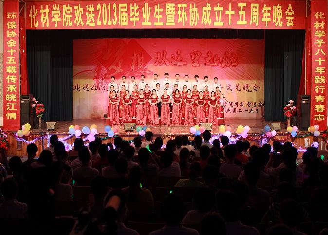 5月25日晚,赭山校区大礼堂华灯璀璨、歌声嘹亮、舞姿翩翩,维多利亚3308老品牌欢送2013届毕业生暨环协成立十五周年文艺晚会在此精彩上演。晚会分别以“青春”、“感恩”、“追梦”三个篇章展开。用艺术的形式诠释着化材学子积极向上的青春风采,更是学院对2013届毕业生深挚的祝福与期望,希望全体毕业生的梦想从这里起航,用不朽的青春去书写璀璨的未来。