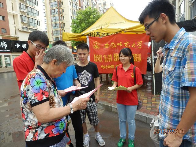 虽然遇上了大雨天气,使实践活动的开展加大了难度,但是队员们依旧兴致勃勃,传递爱心的热情风雨无阻。团队成员兵分两路,一队向居民们宣传介绍本次的重点实践活动的内容“爱心家教”,并告诉他们详细的报名方式。经过队员们认真地宣传,很快便有很多家长了解到了我们的活动,主动前来询问并报名加入,主要集中在英语学科的辅导。另一队队员在淮河新城小区附近沿街进行关于环境保护的问卷调查。