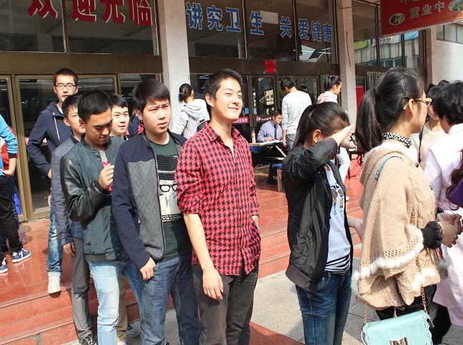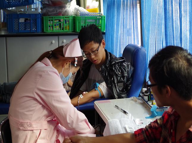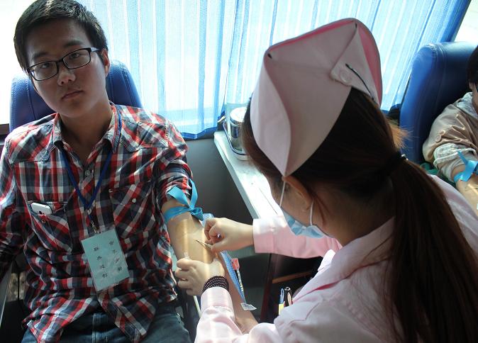 正午时分,阳光明媚。献血车前,同学们经过填表、体检等程序后排列着整齐的队伍等待献血,可爱而又可敬;由学院第19期入党积极分子培训班学员组成的志愿服务者们早已忙得不可开交,他们有的忙着送水,有的忙着为献血同学拎包,有的忙着帮献血同学调整心情、缓解紧张情绪。献血现场,很多同学因体重不合格未能成功献血,陈老师主动走上前去鼓励他们平时要加强锻炼并安慰道,“你们的奉献精神与其他同学都是一样的!”。袁青兵老师也献出了自己的一份爱心,融入到献血的队伍中,他脸上洋溢的笑容,更激起同学们浓厚的献血热情。