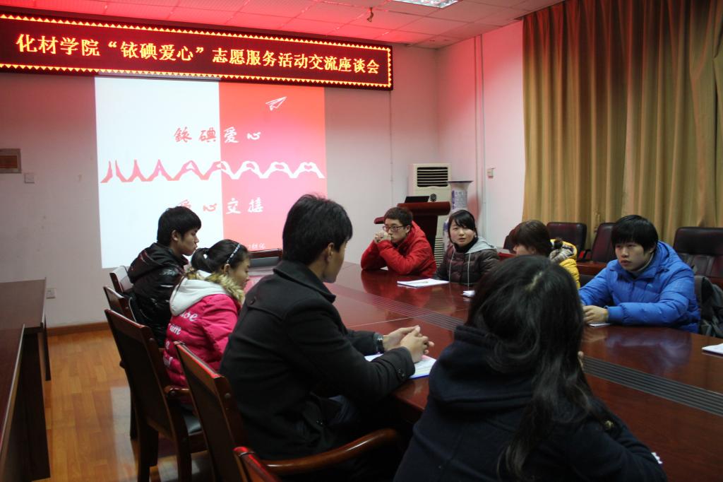 为进一步推进我院志愿服务工作的常态化、专业化,3月6日晚7点,维多利亚3308老品牌“铱碘爱心”志愿服务活动交流座谈会在院会议室成功举行,院团委副书记凌从祥,2011级材化“铱碘爱心”负责人李蔓、刘刚、闻志鹏与2012级材化十余名志愿者代表进行了深入交流,座谈会由2012级辅导员赵全胜主持。