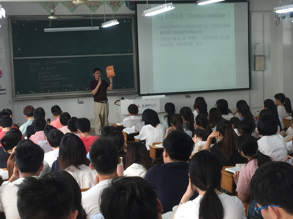 课程伊始,周老师带领同学们一起回顾了“高分子助剂——抗氧化剂”的作用、机理等重要知识点。课上,周老师紧扣“热稳定剂”这个主题,从定义及作用、市场概况及发展趋势、PVC降解机理及稳定剂稳定机理、主要品种及基本要求、研究方法,生产工艺及设备等方面展开了教学。在讲到机理时,周老师用简单易懂的“解拉链”比喻解释了晦涩难懂的机理。烯丙位的氯易脱去,形成新的烯丙位的氯,从而一直延伸下去,从而导致产品性质发脆、颜色发黑、不好成型。另一方面,周老师凭借多年科研工作和在企业中积累的丰富经验,使得课程教学更具有实际应用的价值。他大胆鼓励同学们有想法就去做,有机会就去把握,有条件要积极尝试创新创业。在讲到企业新发展时,更是将自己的新发现的配方倾囊相授。周老师以简单易懂的语言,认真负责的态度,循循善诱的教学方法使知识传授的课堂变得丰富而生动。老师讲得用心,学生听得认真。
