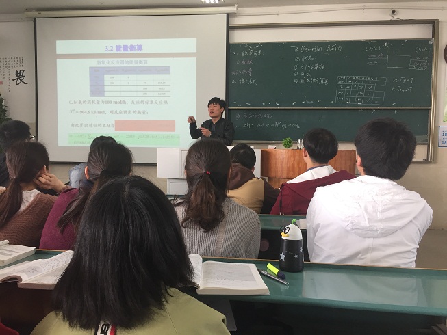 本次课堂教学的主题是反应过程的能量衡算,是2015级化学工程与工艺学生的专业课程,课堂氛围生动活泼,课堂知识被老师讲解的通俗易懂,效果很好。上课伊始,云瑞瑞老师通过对能量衡算的基本依据引入主题,结合物理化学,化工原理等多门学过的知识全方面引入知识点,从无化学反应和有化学反应两个方面入手,通过水热锅炉进水和氨氧化反应的例题,层层深入,严谨分析,引发了同学们的思考和互动,使学生更好地掌握知识点。